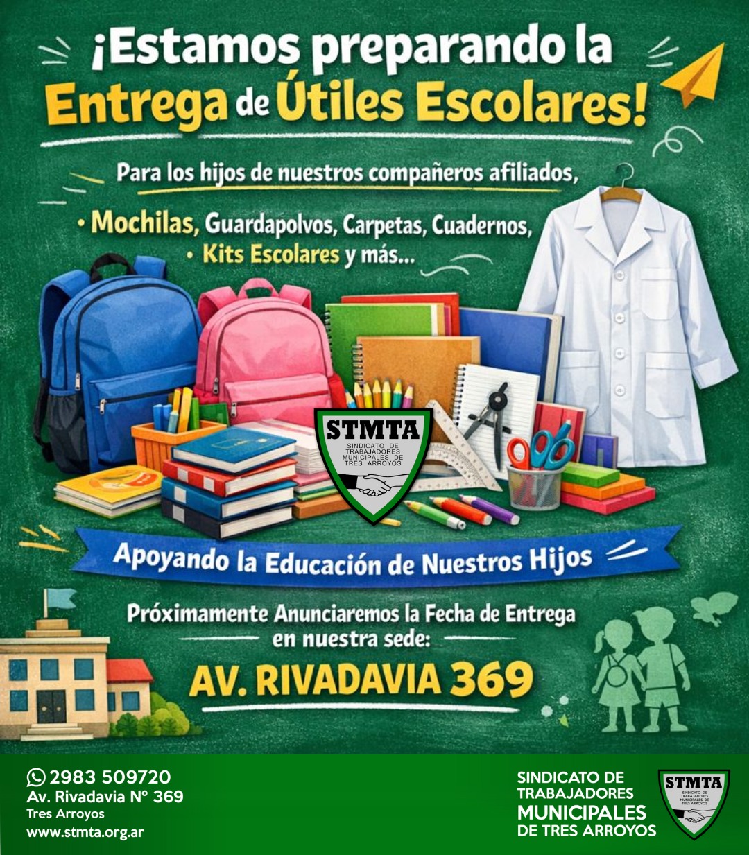 Ya estamos trabajando en la planificación para la adquisición de los elementos necesarios para la entrega de útiles escolares para los hijos de nuestros compañeros afiliados. Los kits a entregar incluyen mochilas, guardapolvos, carpetas, repuestos de hojas, cuadernos, kits de geometría, etc.