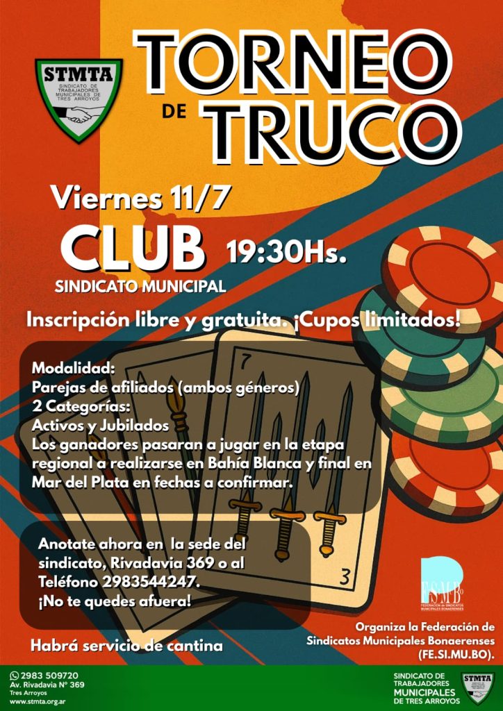 El próximo viernes 11 se llevará a cabo la primera etapa del torneo provincial de Truco por parejas que organiza